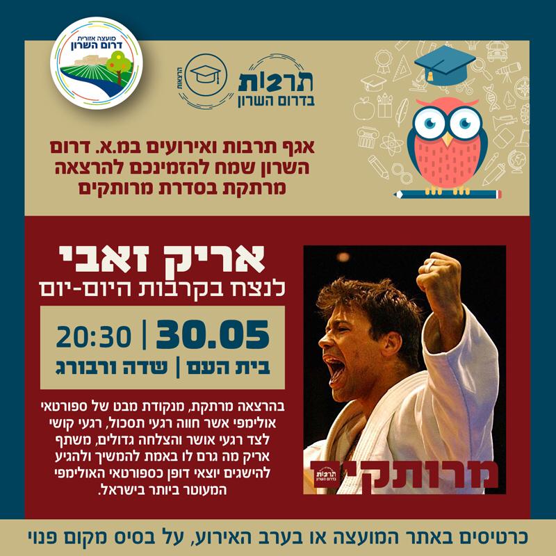 אריק זאבי- לנצח בקרבות היום יום במסגרת "מרותקים" סדרת ההרצאות שתשאיר אתכם קרוב לבית מתכבד אגף תרבות ואירועים להזמינכם להרצאתו של אריק זאבי יום ה' | 30.5.19| בשעה 20:30| בית העם שדה ורבורג הרצאה מרתקת, מנקודת מבט של ספורטאי אולימפי אשר חווה רגעי תסכול, רגעי קושי לצד רגעי אושר והצלחה גדולים, משתף אריק מה גרם לו באמת להמשיך ולהגיע להישגים יוצאי דופן כספורטאי האולימפי המעוטר ביותר בישראל. אריק זאבי , ג'ודאי , זוכה מדליית ארד אולימפיאדת אתונה (2004) , 4 פעמים אלוף אירופה (2001 ,2003 ,2004 ,2012 ) , וסגן אלוף עולם (2001 ) במשקל הפתוח באמתחתו 9 מדליות בסך הכל מאליפויות אירופה שבהן לקח חלק. אחרי ההפסד באולימפיאדת סידני 2000, נאלץ אריק לגייס את עצמו למסע של 4 שנים נוספות בשביל הזכות להתמודד על מדליה אולימפית. ב-2004 הוא עשה זאת וזכה במדליית ארד אולימפית , 2500 ישראלים שרו לו את שירת התקווה באחד הרגעים המרגשים בחייו. "כולנו חובים כשלונות ורגעי משבר, השאלה היא איך אנחנו מגייסים את עצמנו לקראת ההתמודדות הבאה " ? עלות כרטיס- 40 ₪ רכישת כרטיסים מראש באתר המועצה או בלינק: https://www.minipay.co.il/pages/main.aspx?v=6001130 מס' המקומות מוגבל !!! הקדימו להירשם. ניתן לרכוש כרטיסים, בכניסה לאירוע על בסיס מקום פנוי בלבד! פרטים נוספים: ניתן לפנות לאגף תרבות בטלפון : 052-6558355 בברכה, צוות אגף תרבות מועצה אזורית דרום השרון